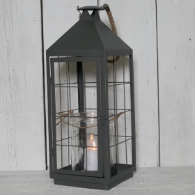 tall grey metal lantern with a glass votive insert. (candle not included)